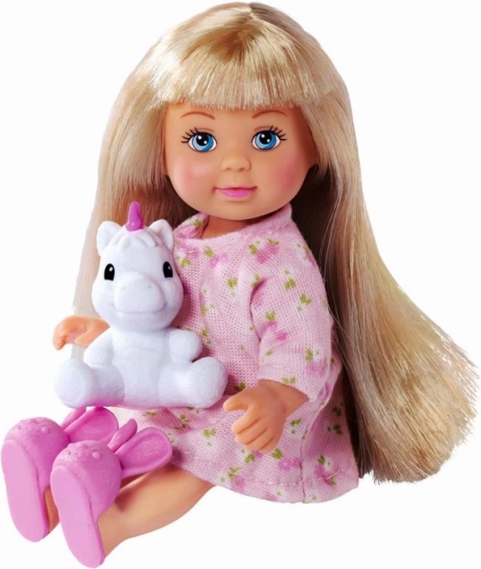 - Dukke Evi (ca. 12 cm), hemseseng med stige, skrivebord, stol, rygsæk, laptop, skoletilbehør, enhjørning-figur og andet tilbehør (i alt 14 dele)