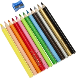 Klassiske Bambino farveblyanter med intense farver og træoverflade. Sættet indeholder 12 farver og en blyantspidser, hvilket gør dem perfekte til kreativ tegning og let temperering.