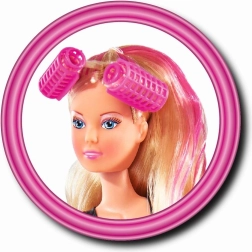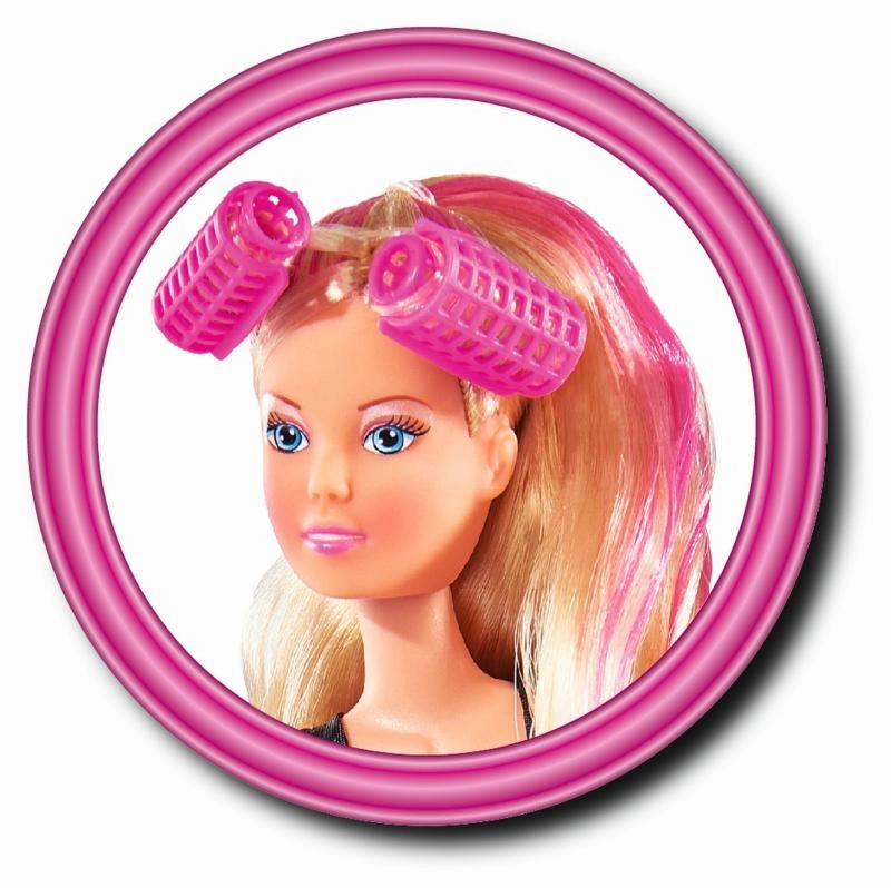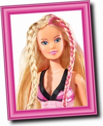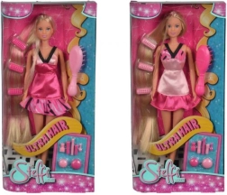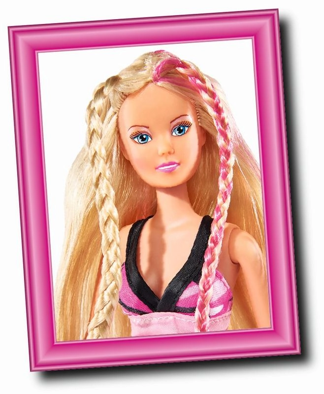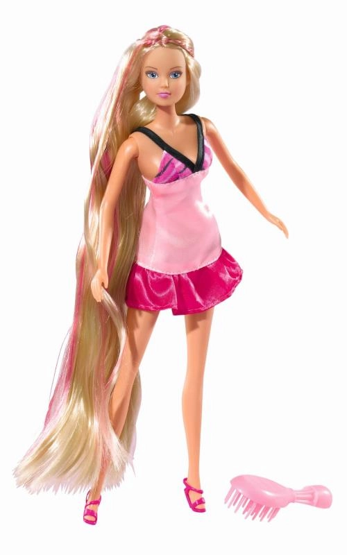 Dukke Steffi med ekstra langt hår med kam, børste, hårtørrer og krøllejern. Dukkens højde er 29 cm.