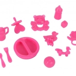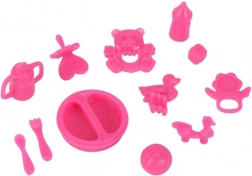 Sættet indeholder forskellige lyserøde plastiklegetøj som tallerken, bestik og flaske, der beriger legeoplevelsen.