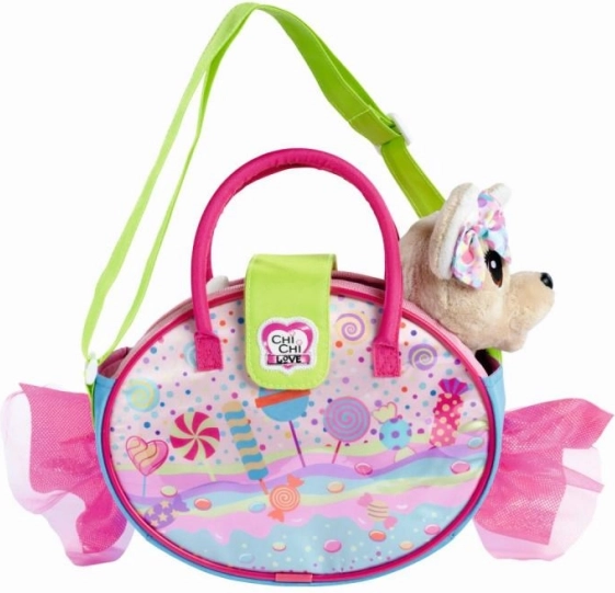Den søde chihuahua CHI CHI LOVE i udgaven Sweetest Candy vil glæde ethvert barn med en stilfuld håndtaske formet som slik, en praktisk skulderrem og legende vedhæng. Hunden i blød plys måler 20 cm, er ideel til kram og på farten og styrker empatien. Den perfekte gave til børn fra 3 år.
