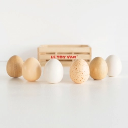 Oplev magien ved realistisk leg med trææg i kasse fra Honeybake-kollektionen. Seks omhyggeligt udformede æg af gummitræ i en robust trækasse er ideelle til små børnehænder og daglig leg. Kvalitetsmaterialer og sikre farver sikrer lang holdbarhed og hensyn til planeten.