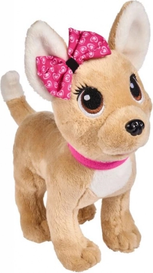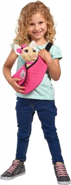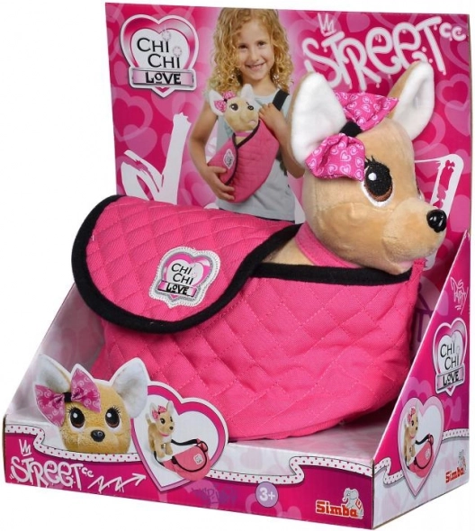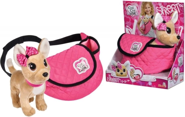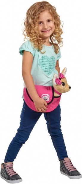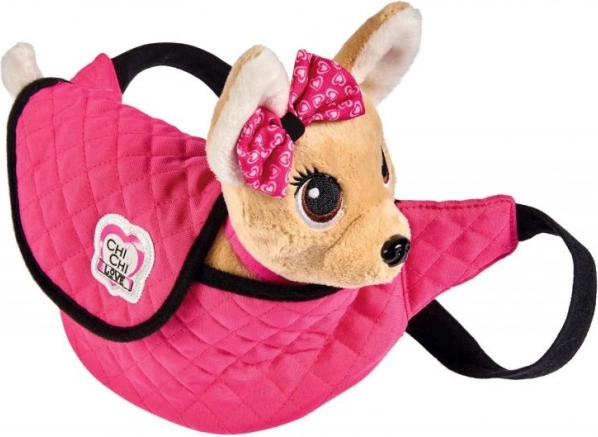 Tag på eventyr med plyshunden Chi Chi Love, det perfekte modeaccessory for alle små hunde-elskere. Dens elegante lyserøde halsbånd matcher perfekt den moderne lyserøde taske med sort kant, ideel til stilfuld bæring.