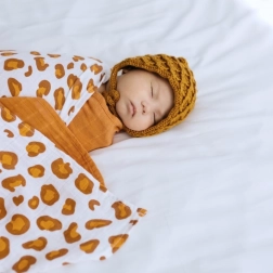 Bomuldsmusselin-stofble TOMMY LISE i størrelsen 120 × 120 cm med motivet hvid leopard er blød, åndbar og skånsom mod babys sarte hud. Takket være den alsidige anvendelse fungerer den som svøb, tæppe og barnevognstæppe, og den bliver endnu blødere for hver vask.