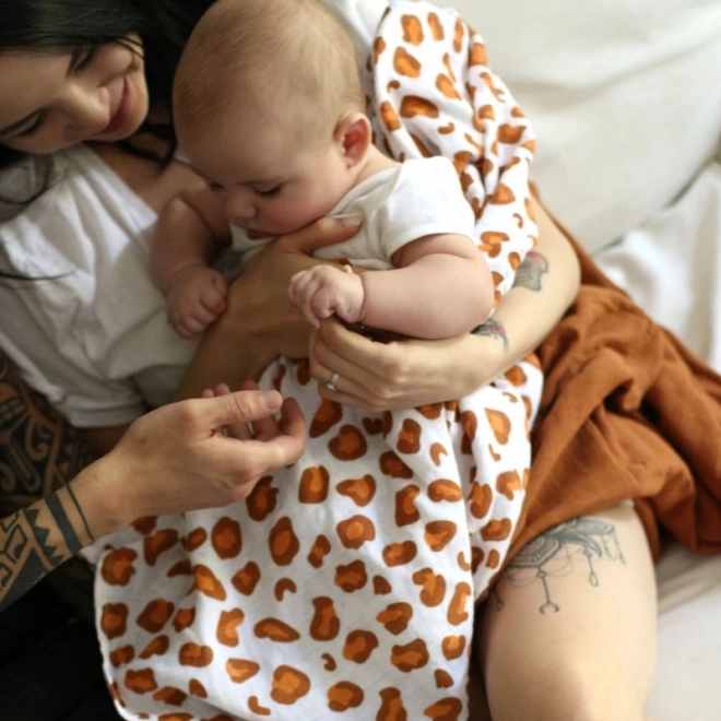 Med de generøse mål 120 × 120 cm er den ideel til svøb, afdækning og daglig brug både hjemme og på farten. Det stilfulde motiv hvid leopard glæder forældre, der ønsker et praktisk tilbehør med moderne design.