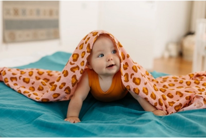 Den generøse størrelse 120 × 120 cm giver et væld af anvendelser: fra svøb og barnevognstæppe til hagesmæk eller underlag. Det stilfulde print af en leopard i koralnuancer er en fryd for øjet og passer smukt til både børneværelse og rejseudstyr.