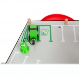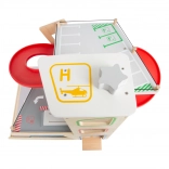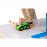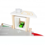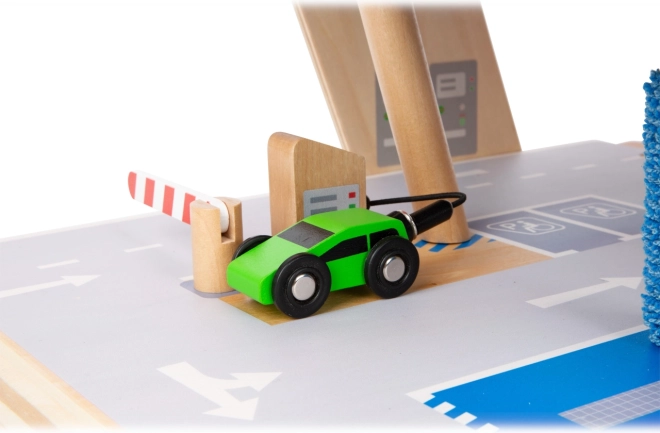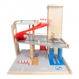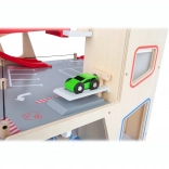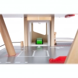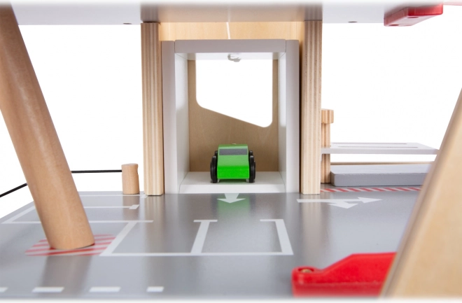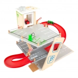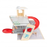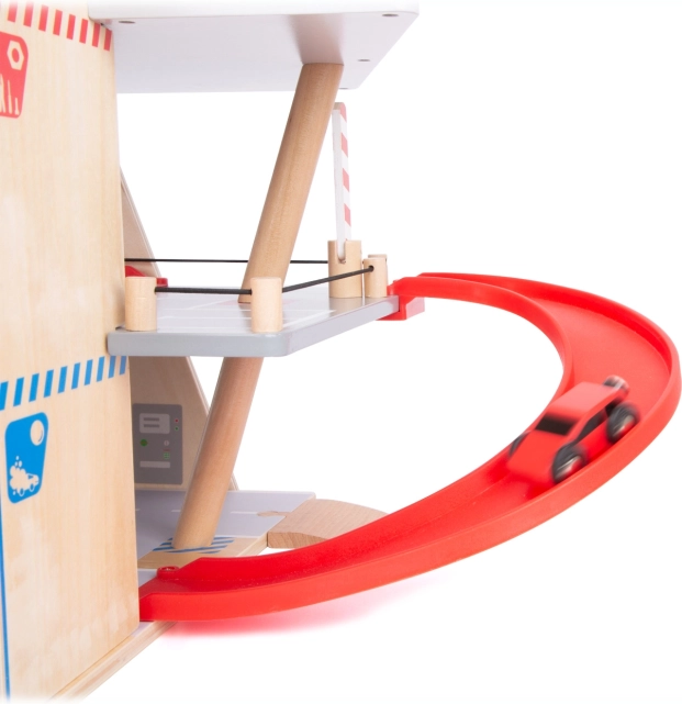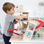 Dette premium parkeringshus i kvalitets krydsfiner tilbyder tre rigt udstyrede niveauer forbundet med en funktionel elevator og to glidende ramper. Børn kan parkere, tanke, lade, vaske og reparere – alt på ét sted, med realistiske elementer og fantastisk legeværdi.