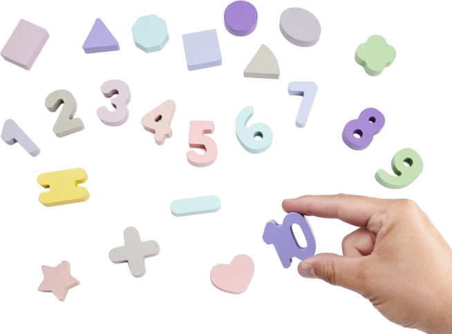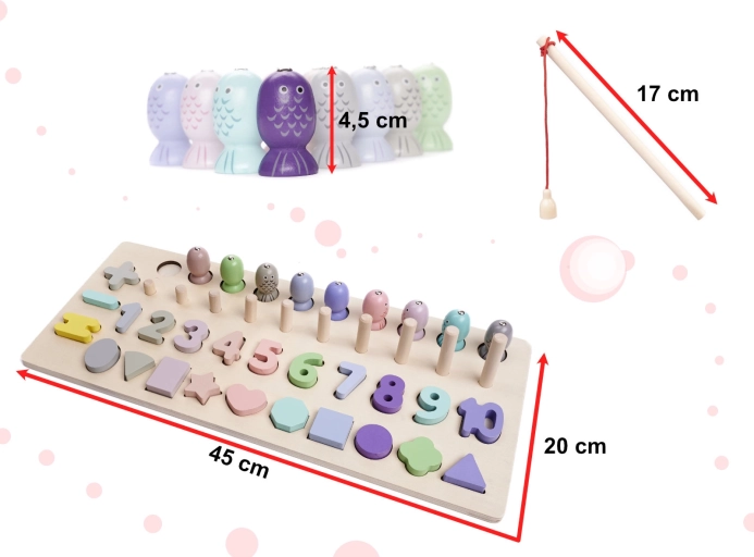 - Pakkens indhold: træbase, træfisk, magnetisk fiskestang, tal og matematiske tegn 1–10, 10 geometriske former, 50 tælleringe.