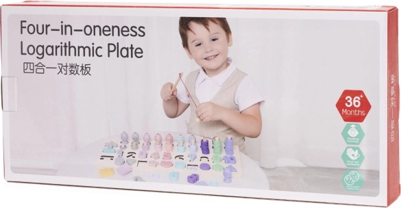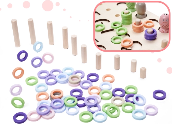 På den solide træbase venter udskæringer til tal og former, ti pinde til at stable farvede ringe samt et lille fiskespil med træfisk og magnetisk fiskestang. Hver pind svarer til et bestemt tal – barnet forstår naturligt forholdet mellem tal og mængde.