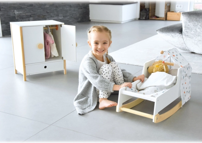 Den robuste trækonstruktion, stabile forarbejdning og sikre, afrundede kanter giver en behagelig og tryg legeoplevelse. Skabet fremmer selvstændighed, sans for orden og udvikler fantasien gennem rolleleg med dukkepasning.