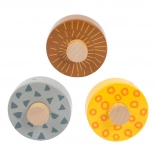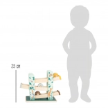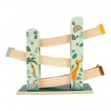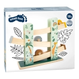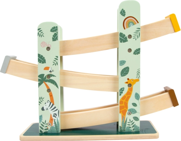 Denne smukke træbane giver børn mulighed for at se på, hvordan tre hjul, hver med et unikt design, ruller ned ad tre ramper. Den er dekoreret med illustrationer af safari- og junglelevende dyr og planter.