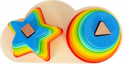 Stabeltårn Regnbue Duo er et trælegetøj designet til at støtte læring og udvikling hos børn. Det giver mulighed for at arrangere delene efter størrelse og form - stjerner og cirkler - i et strålende farverigt design. Dette legetøj stimulerer genkendelse af farver og koordinationsevner, mens børnene sjovt bygger regnbuen.