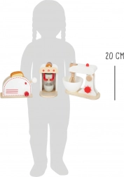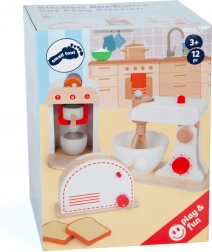 Dette stilfulde træ-sæt bringer tre af de mest populære apparater til legekøkkenet: brødrister, kaffemaskine og mixer. Realistiske funktioner som klikkontroller, udløserhåndtag på brødristeren og roterende piskeris på mixeren stimulerer fantasi, selvstændig leg og udvikling af finmotorik.