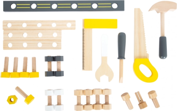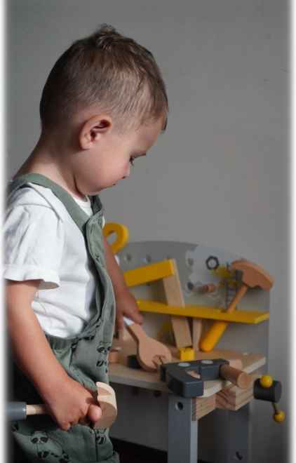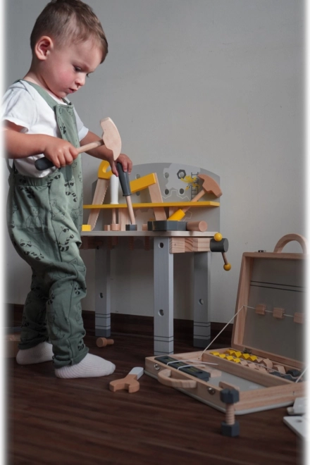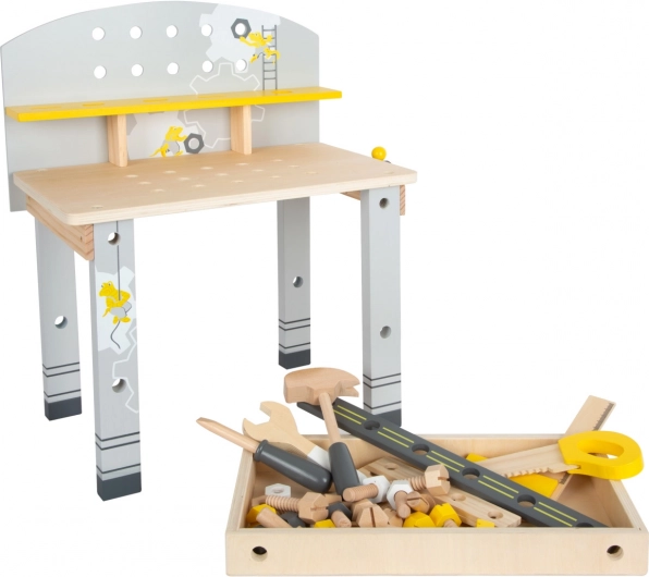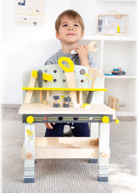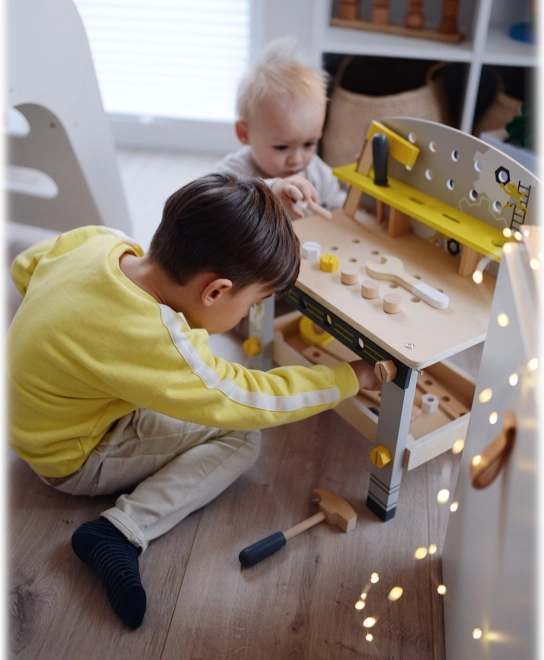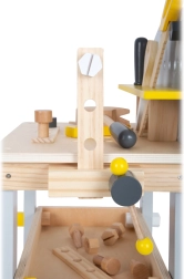Arbejdsbænken indeholder sav, klemme, skruetrækkere og andre værktøjer, som giver børnene mulighed for at efterligne rigtige byggeprojekter.