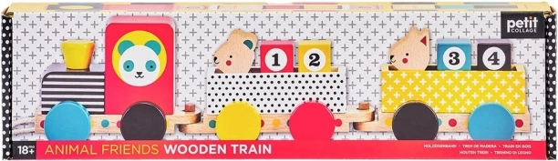 Dette moderne trætog har et lokomotiv og to vogne, fire klodser med tal og to søde dyrevenner. Børn kan trække det i snoren, bygge og omrokere klodser og figurer, mens de udvikler fantasi, logik samt fin- og grovmotorik.