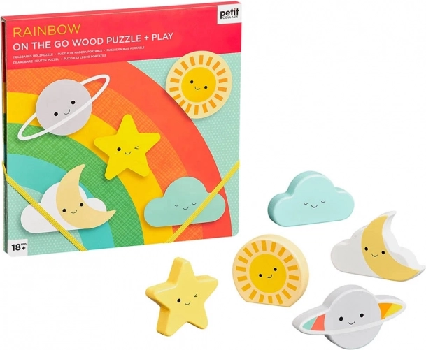 Holdbart træpuslespil til de mindste fra 18 måneder. 5 træbrikker, 2 legescenarier og et muntert regnbuemotiv støtter finmotorik, koncentration og glæden ved at opdage. Fremstillet af træ og genbrugspapir.