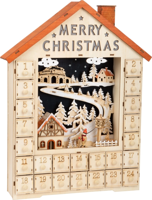 Denne julekalender er udstyret med LED-belysning, der drives af to AA-batterier. Du kan nemt styre lyset med en lille kontakt og dermed skabe en hyggelig atmosfære på vinteraftener.