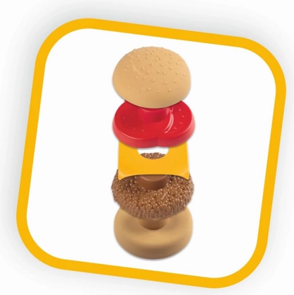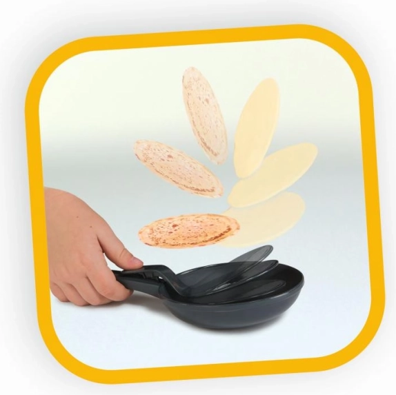 Fra pande og redskaber til burger, pommes frites, saucer og kreditkort. Pandekagen skifter farve, når den vendes på panden, for endnu mere sjov.