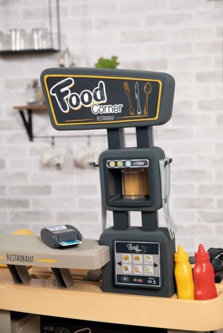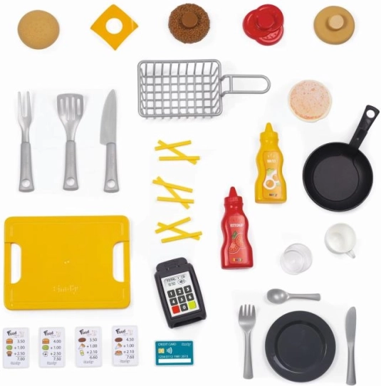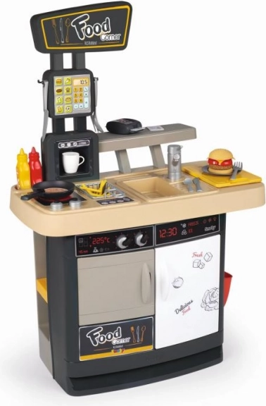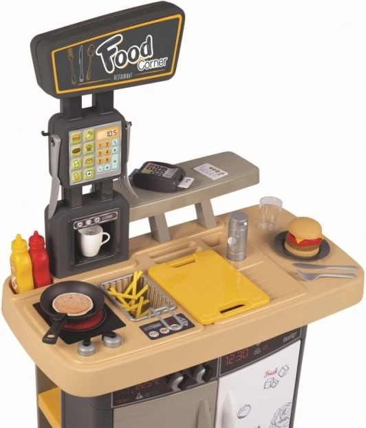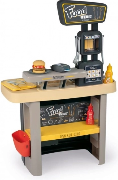 Åbn din egen lille fastfood! Børnenes Food Corner 2-i-1 fra Smoby kombinerer køkken og udleveringsdisk med kasse. Børn kan tilberede burgere, pommes frites eller pandekager og samtidig betjene kunder ved disken – præcis som i en rigtig restaurant.