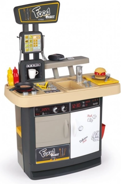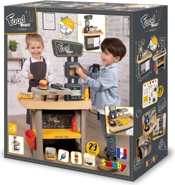 Sættet Smoby Food Corner 2-i-1 forvandler værelset til en lille restaurant med område til både madlavning og betjening af kunder. Det byder på realistiske funktioner, rigt tilbehør (29 dele), kasse med betalingsterminal og menu til valg af retter – ideelt til at udvikle fantasi, kommunikation og samarbejde.