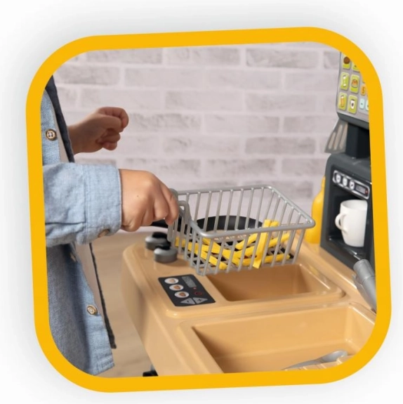 Sættet imponerer med masser af detaljer: kogeplade, friture, vask med hane, ovn, køleskab, drikkedispenser, kaffemaskine og ophængte kroge til redskaber. Der mangler heller ikke betalingsterminal, kvitteringer, kreditkort eller trykt menu. Efter legen kan “rester” ryddes i skraldespanden. I alt 29 dele understøtter rige rollelegesituationer og finmotorik.
