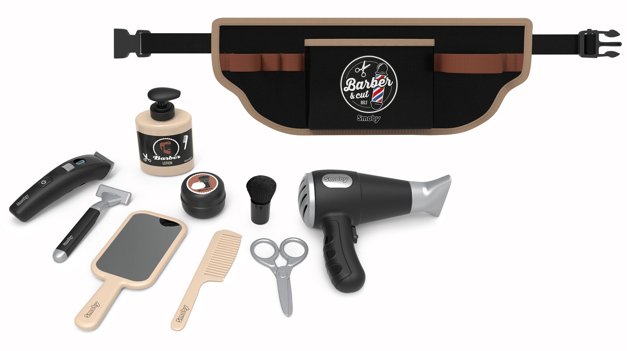 Frisørbæltet til børn Smoby myBeauty forvandler hver dag til et sjovt salon-eventyr. Med det justerbare bælte har børnene alle redskaber sikkert opbevaret og altid ved hånden – fra hårtørrer og saks til kam og barbermaskine. Den interaktive hårtørrer afgiver realistiske lyde, så legen føles helt ægte.