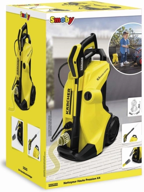 Smobys legetøjshøjtryksrenser er en detaljeret replika af den populære model KÄRCHER K 4. Den tilbyder sikker vandspray med to trykniveauer, når den er tilsluttet en almindelig haveslange. Takket være den lave vægt og hjul, der ruller let, kan børn flytte den hvor som helst.