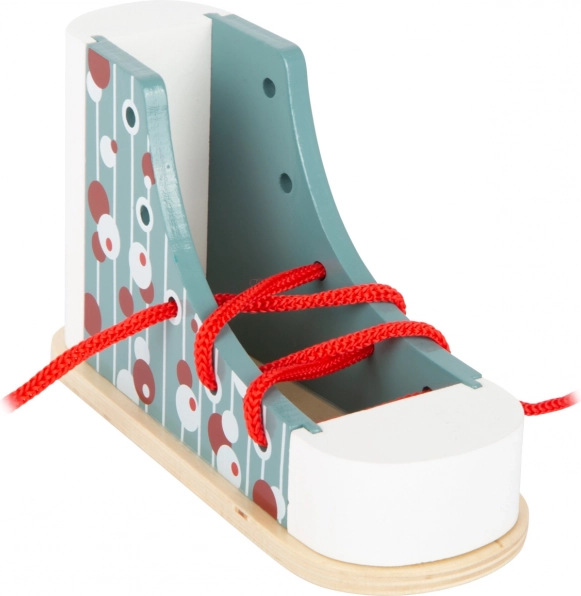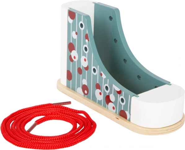 Dette trælegetøj er designet til at gøre det lettere for børn at lære at binde snørebånd takket være dets realistiske udseende og sjove design.