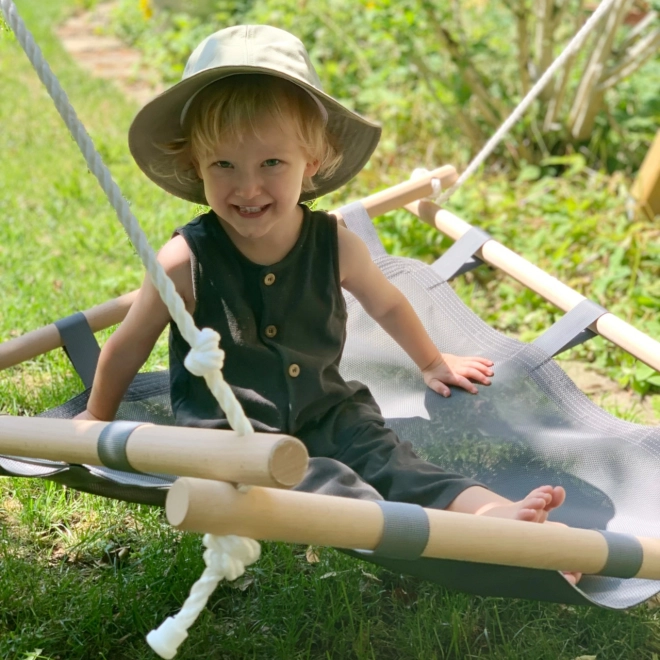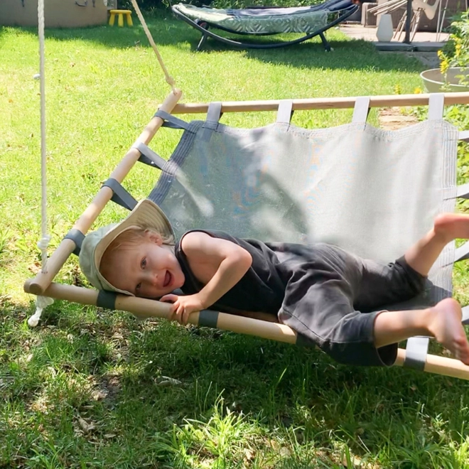 Gyngen er udstyret med en stabil ramme af naturtræ, der kombinerer æstetik og funktionalitet for maksimal gyngeglæde.