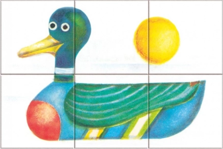 Med seks solide træklodser kan børnene nemt samle en and og andre billeder. De farverige illustrationer indbyder til leg, der styrker koncentration og tålmodighed.