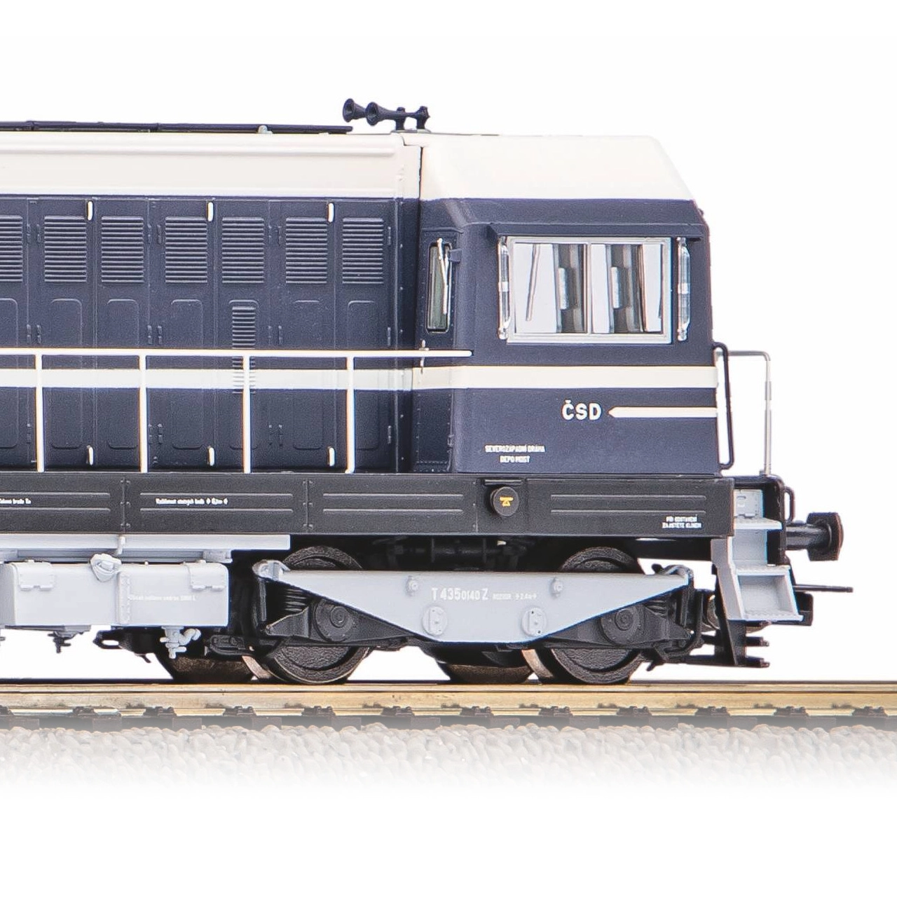 Eksempel på lyd fra den indbyggede digitale dekoder. Nyhed for 2021 i Expert-produktserien! Trofast og detaljeret model af ranger-diesellokomotivet T 435 (BR 107) i ČSD-farver og -tryk. Præcis udførelse forstærkes af prægede detaljer på lokomotivets front. Farveudførelse og tryk, inklusive alle dekorative elementer, er af højeste kvalitet, svarende til produktserien. Modellen er udstyret med en kraftig motor med svinghjul. Hvidt/rødt LED-lys skifter afhængigt af kørselsretningen. Førerkabinen og nummerpladen er også oplyst, alt kan skiftes via digital styring. Modellen er udstyret med digital dekoder med lydmodul og højttaler, som indeholder et lydbibliotek tro mod forbilledet. Den er kompatibel med protokollerne DCC, Rail-ComPlus®, Motorola® og Selectrix® og muliggør også drift i analog tilstand. Den relevante driftstilstand registreres automatisk. Med styreenhederne PIKO SmartControl, eller enheder kompatible med mfx®-formatet, tilbydes brede muligheder for individuel mapping. Til lokomotivet tilbydes vogne af tilsvarende type og udførelse. Hovedegenskaber: indbygget digital dekoder med lydmodul og højttaler; fire aksler; motor med to svinghjul; to bånderede trækhjul; lys med farveskift efter kørselsretning; interiørbelysning; PluX22-grænseflade iht. NEM 658; koblingsskakt iht. NEM 362 med kortkoblingskinematik. Dokumentation: brochure til BR 107/T 435 (DE); generelle oplysninger om BR 107/T 435 (DE, EN, F, NL); brugervejledning og reservedelsliste til model nr. 52428 (DE, EN, F, CZ)