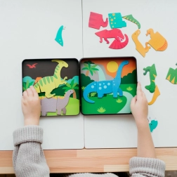 Det magnetiske legetøjssæt dinosaurer fra Petit Collage giver børn uendelig kreativitet og sjov. Takket være de robuste magnetiske dele kan de nemt skabe deres egne dinosaurer og scener, som får liv på de to tematiske baggrunde. Den praktiske metaldåse holder alting samlet og er perfekt til at tage med på rejser.