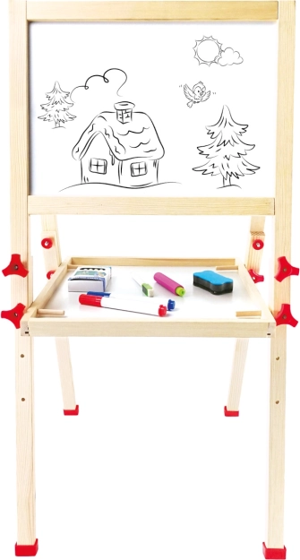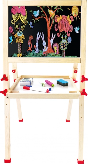 Denne kvalitets børnetavle kombinerer en hvid magnetisk overflade til at fastgøre billeder og skrive med tusch med en klassisk skifertavle til tegning med kridt. Takket være højdejustering og den stabile trækonstruktion vokser den med barnet og passer perfekt på børneværelset og i legerummet.