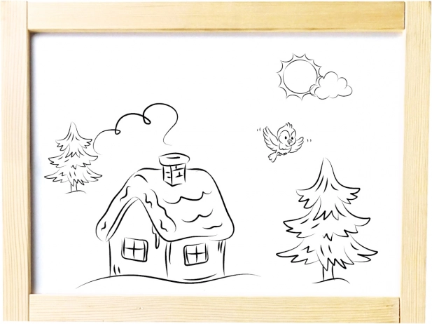 Pakken indeholder alt nødvendigt: kridt, tusch, svamp og flere magnetiske billeder. Tavlen kan hurtigt klappes sammen og opbevares pladsbesparende, så den ikke fylder meget. De to arbejdsflader gør det muligt, at to børn kan skabe samtidig.