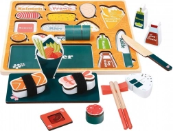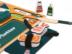 Sættet inkluderer trækomponenter som sushi, saucer, bestik og en kniv til "skæring", hvilket muliggør realistisk og kreativ leg. Dette spil er egnet til børn fra 36 måneder, men overvågning fra en voksen anbefales til børn under 3 år.