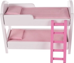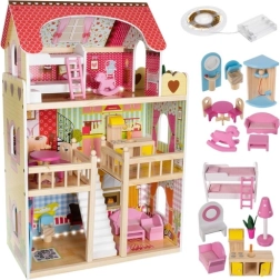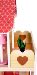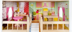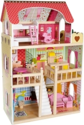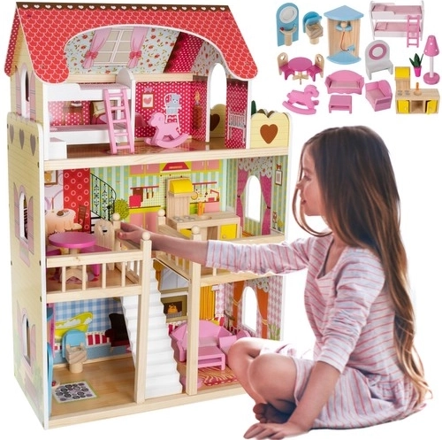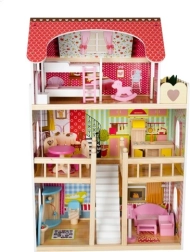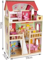 Huset har tre niveauer forbundet med hvide trapper, fem værelser og en altan, ideel til leg med hele dukkenes familie.