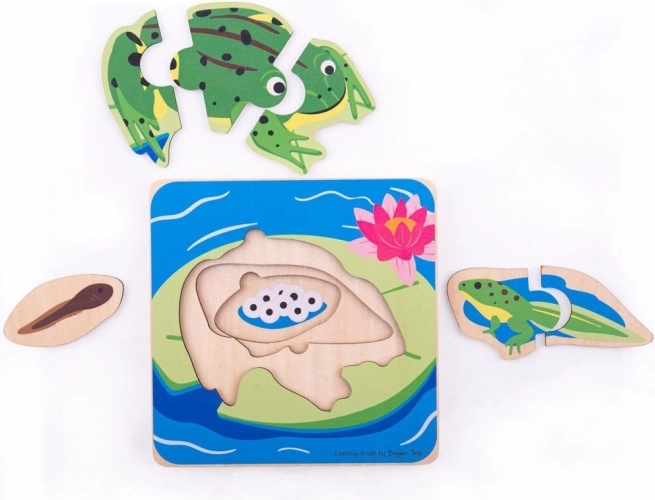 Udforsk frøens livscyklus med dette lagdelte puslespil fra Bigjigs Toys. Puslespillet har 4 lag og indeholder 7 brikker, som både underholder og uddanner børn. Hvert lag viser en anden udviklingsfase og gør det lettere for børn at forstå forvandlingsprocessen.