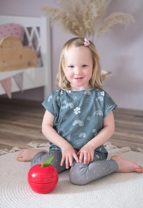 Glatte, robuste trædele i klare farver suppleret med et filtblad. Behagelige at holde ved, sikre og klar til hyppig leg.