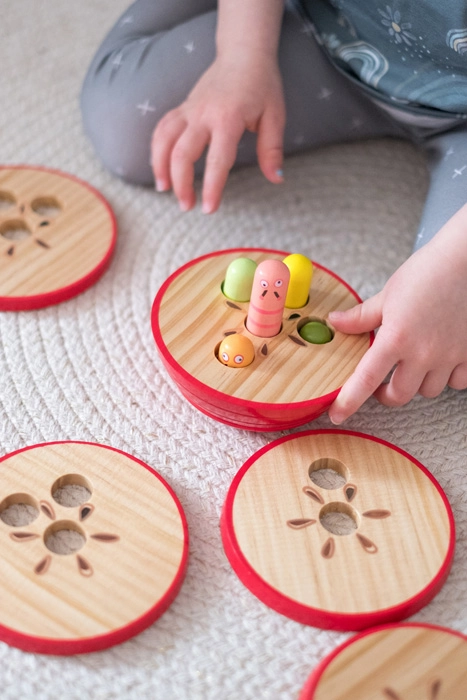 Dette smarte æblepuslespil opfordrer børn til at lægge de enkelte lag, så antallet af huller i laget svarer til antallet af orme, der lige kigger frem fra soklen. Hver orm har en anden højde, så børnene træner naturligt logik, tålmodighed og evnen til at skelne mellem former og størrelser.