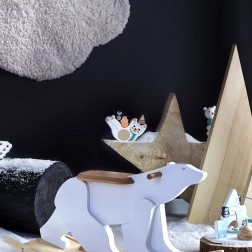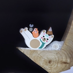 Børn stabler dyr, snefnug og former på den vuggende bjørn og lærer at afbalancere hver brik med følsomhed.