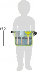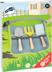Praktisk børnebæltetaske med haveværktøj fra mærket small foot lader små gartnere hjælpe i haven og samtidig have hænderne fri. Sættet indeholder 3 metalredskaber med træhåndtag – en skovl, en rive og en spade – i børnestørrelse. Den justerbare rem med klikspænde og de slidstærke lommer sørger for sikker opbevaring af udstyret. Leg i haven understøtter motorik, rolleleg og en relation til naturen.