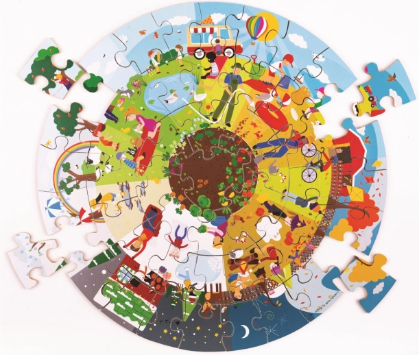 Det runde gulvpuslespil til børn fra Bigjigs Legetøj tilbyder en unik måde for børn at lære om sæsonændringer. Hver puslespilsbrik er omhyggeligt designet til at skabe en samlet 360 graders scene, der præsenterer forskellige aktiviteter og landskaber karakteristiske for forår, sommer, efterår og vinter.