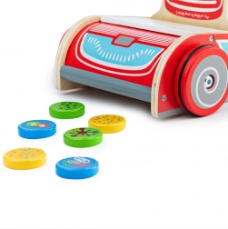 En skjult magnet på undersiden af støvsugeren fanger farvede træskiver, så børn får øjeblikkelig feedback og en leg, der virkelig fungerer.