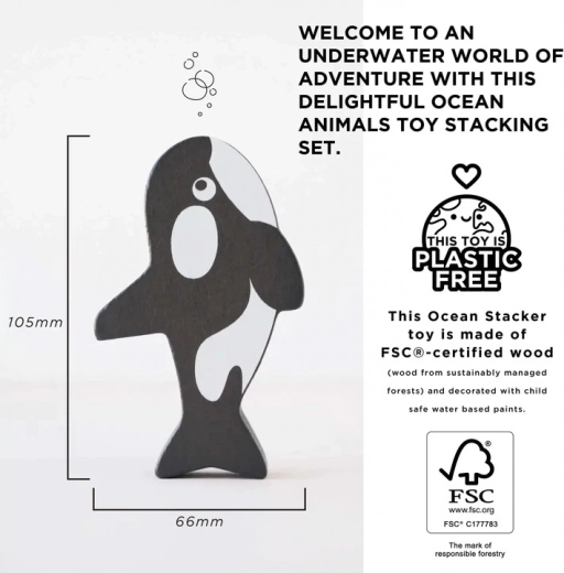 Denne kvalitets-træstabel med havtema giver børn fra 18 måneder mange timer med sikker og kreativ leg. Brikkerne i form af hval, delfin, søstjerne, pingvin, havskildpadde, vandmand og andre havvenner er designet til at ligge godt i små hænder og understøtter hånd-øje-koordination, tålmodighed og fantasi.