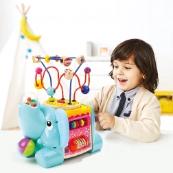 En sjov motorisk terning formet som en elefant til børn fra 18 måneder, der udvikler finmotorik, logisk tænkning og hånd-øje-koordination. Den byder på mangeartede aktiviteter, herunder et motorisk labyrint, dreje- og skydbare elementer, som understøtter kreativitet, læring af farver og former samt koncentration.