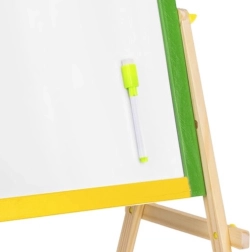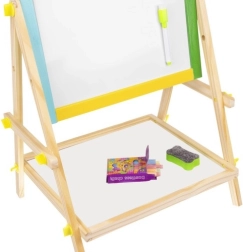 Dobbeltsiddet trætavle til børn med sort kridtside og hvid (tøraftørrbar) side, som styrker kreativitet, læring og finmotorik. Den farvede ramme er af glatforarbejdet træ, og den stabile konstruktion suppleres af en praktisk hylde til tilbehør. I pakken finder du en tusch, en svamp og kridt – klar til brug med det samme.