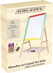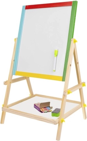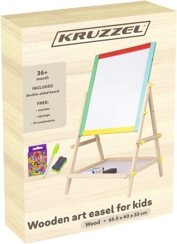 Denne dobbeltsiddede KRUZZEL-tavle tilbyder to flader til tegning og skrivning: en kridtside og en tøraftørrbar side. Enkelt drej og fingerskruer gør det let at skifte side hurtigt. Den træramme med farvede elementer er solid, glat og sikker for børn.