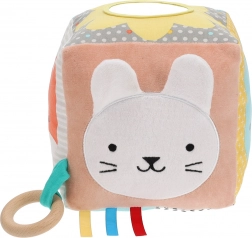 Terningen er lavet af økologisk bomuld og fyldt med materiale fra genbrugte plastflasker, hvilket gør den til et miljøvenligt og sikkert produkt for dit barn.