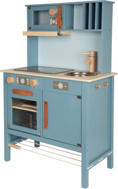 Børnekøkken i røgblå nuance med stilfulde læderhåndtag giver en realistisk madlavningsoplevelse.