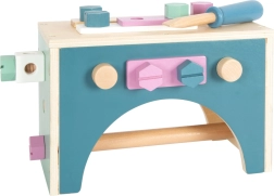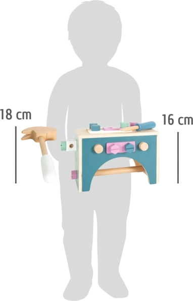 Praktisk trækasse med værktøj 2-i-1 giver børn uendelige legemuligheder takket være sin alsidighed. Ved at vende kassen kan den bruges som arbejdsplade, og alt værktøj kan nemt opbevares via hullerne i siderne.